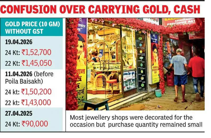 Kolkata: Akshay Tritiya started on a muted note on Sunday with lower than expected footfall across jewellery stores in Kolkata. City jewellers however expect a better turnout on Monday as the auspicious occasion stretches over two days. They also apprehended that many buyers stayed away from purchasing gold this time as there was confusion over carrying “old gold” or cash.“We are witnessing a low enquiry this time and the overall spirit seems to be down. Many buyers are confused over the norms related to election commission of India’s directives over movement of cash and other items. Cases of seizure are also being reported and buyers are confused over carrying old gold or cash,” said Rupak Saha, zonal member of the Gem and Jewellery Trade Council of India. “One of our buyers has even requested to get the jewellery delivered at his home as he was not sure if will be violating the ECI norms while carrying jewellery,” he added.According to city jewellers, many buyers exchange old gold on Akshay Tritiya and buy new jewellery. Since Jan this year city jewellers started to witness a spike in old gold exchange during the marriage season to bridge the gap between affordability and aspiration.“A normal bangle is made of 10gm gold and that is worth nearly Rs 1.5 lakh. Certainly people are now afraid to carry heirloom jewellery to our stores as most of the family gold doesn’t have any receipt. This has created a lot of uncertainty among buyers this Akshay Tritiya and people are avoiding any untoward incident at naka check points,” said Shubadip Roy of Bengal Jewellery. While the “tithi” for Akshay Tritiya started from 10 am on Sunday, buyers also preferred to purchase it on Monday. “A tithi is incomplete without being preceded by a sunrise. Many prefer to make purchases on Monday,” said Saha.However, Annargha Uuttiya Chowdhury of Anjali Jewellers, said: “We are seeing strong sales this Akshaya Tritya as prices have softened which has increased the purchasing power of the client as they’re able to buy more gold and diamond for the amount they are paying.”At BB Ganguly Street, a cluster of jewellery shops, most shops were decorated for the occasion and staff reported on duty. There was a flurry of customers in the evening but purchase quantity remained small.The industry hoped that sales volume would increase by 3–4% over last year and momentum continued to build. “Customers today are able to derive far greater value for their spend, translating into higher quantity purchases as well as an increased inclination towards diamond jewellery alongside gold,” Chowdhury said.